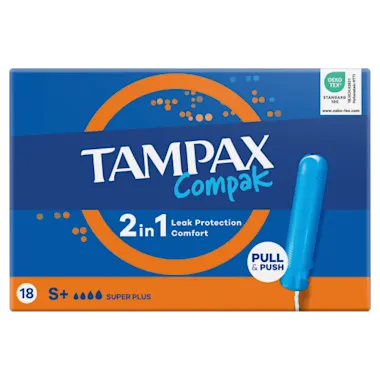 Tampax Compak Super Plus tampons offer protection and discretion for heavy flow days during your period. Tampax Compak tampons come with a compact and discreet plastic applicator and a rounded tip for comfortable insertion. With absorption channels to absorb directly to the core and a protective skirt to help prevent leaks for a worry free period. Tampax Compak tampons have been gynaecologically tested. They have also been independently tested for harmful substances by Oeko-Tex. Trusted leak free protection to let you do whatever you like. Tampax Compak’s best tampons for heavy flow absorbency.