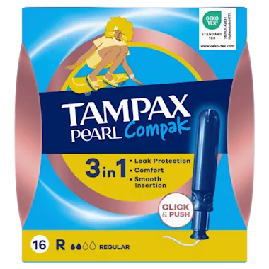 Tampax Pearl Compak tampons are Tampax' best tampons for comfort, protection and discretion. Tampax Pearl Compak tampons come with a compact and discreet smooth plastic applicator and rounded tip for comfortable insertion. Its contoured Anti- Slip Grip makes the applicator easy to hold and position. Tampax Pearl Compak has MotionFit technology that gently expands to fit your body’s unique shape. Additionally there is a LeakGuard braid that helps stop leaks before they happen. Tampax Pearl Compak have bold and colourful wrappers that are easy to open, purse resistant and open silently for full discretion. Tampax Pearl Compak Regular is Tampax' best tampon for regular absorbency. Tampax Pearl Compak tampons have been gynaecologically tested. They have also been independently tested for harmful substances by Oeko-Tex.