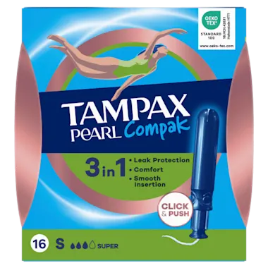 Tampax Pearl Compak tampons are Tampax' best tampons for comfort, protection and discretion. Tampax Pearl Compak tampons come with a compact and discreet smooth plastic applicator and rounded tip for comfortable insertion. Its contoured Anti- Slip Grip makes the applicator easy to hold and position. Tampax Pearl Compak has MotionFit technology that gently expands to fit your body’s unique shape. Additionally there is a LeakGuard braid that helps stop leaks before they happen. Tampax Pearl Compak have bold and colourful wrappers that are easy to open, purse resistant and open silently for full discretion. Tampax Pearl Compak Super is Tampax' best tampon for super absorbency. Tampax Pearl Compak tampons have been gynaecologically tested. They have also been independently tested for harmful substances by Oeko-Tex.